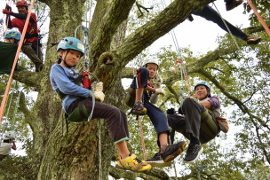 あけちクラブでは、木々の大切さと自然の楽しさやすばらしさを知ってもらうため、「ツリークライミング」の体験会を実施しています。専用のロープとサドル(安全帯)を使って木に登り、木や森・自然との一体感を味わうプログラムです。体力に自信が無くても大丈夫!!
