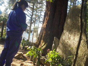 明智光秀が尊敬していた柿本人麻呂が祀ってある場所です。柿本人麻呂は飛鳥時代の歌人で、山部赤人と共に歌聖とよばれるほどすごい人です。社殿には明智氏の家紋の桔梗紋が彫られ、社前には光秀が植えたとされる楓があります。ぜひ柿本人麻呂社におまいりに来てみてください。来たらテストの点きっとUP!!成績上げたい人、全員集合!柿本人麻呂社には、「重軽石」があります。「重軽石」とは、願い事を念じながら石を持ち、軽いと叶うという石です。この「重軽石」を持ってみましょう。ぜひやってみてください。私は叶いました。