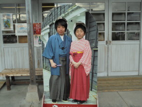 顔はめパネルがおいてあります。この顔はめパネルで写真を撮るコツは、しっかりと顔をパネルの穴の下の部分にのせることです。大正時代の服をほんとうに着ているようにとることができます。