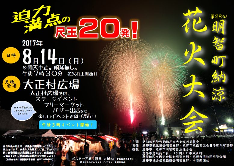 「恵那南高校吹奏楽部・ギターマンドリン部オータムコンサート」開催のお知らせ大正村施設紹介~大正村浪漫亭「大正村かえでまつり」開催のお知らせ「第14回ソフトバレーあけちまちづくり大会」参加チーム募集!あけちクラブ「ツリークライミング体験会」参加者募集!「若一神社・八王子神社例大祭」開催のお知らせ10月~11月の大正村情報大正村施設紹介~街道特集「市民講座2017後期」「貯筋運動教室」受講者募集!9月10月の明知鉄道情報「第11回住民による町内一斉清掃」開催のお知らせ「第28回明智町納涼花火大会」開催のお知らせ 222324252627282930
