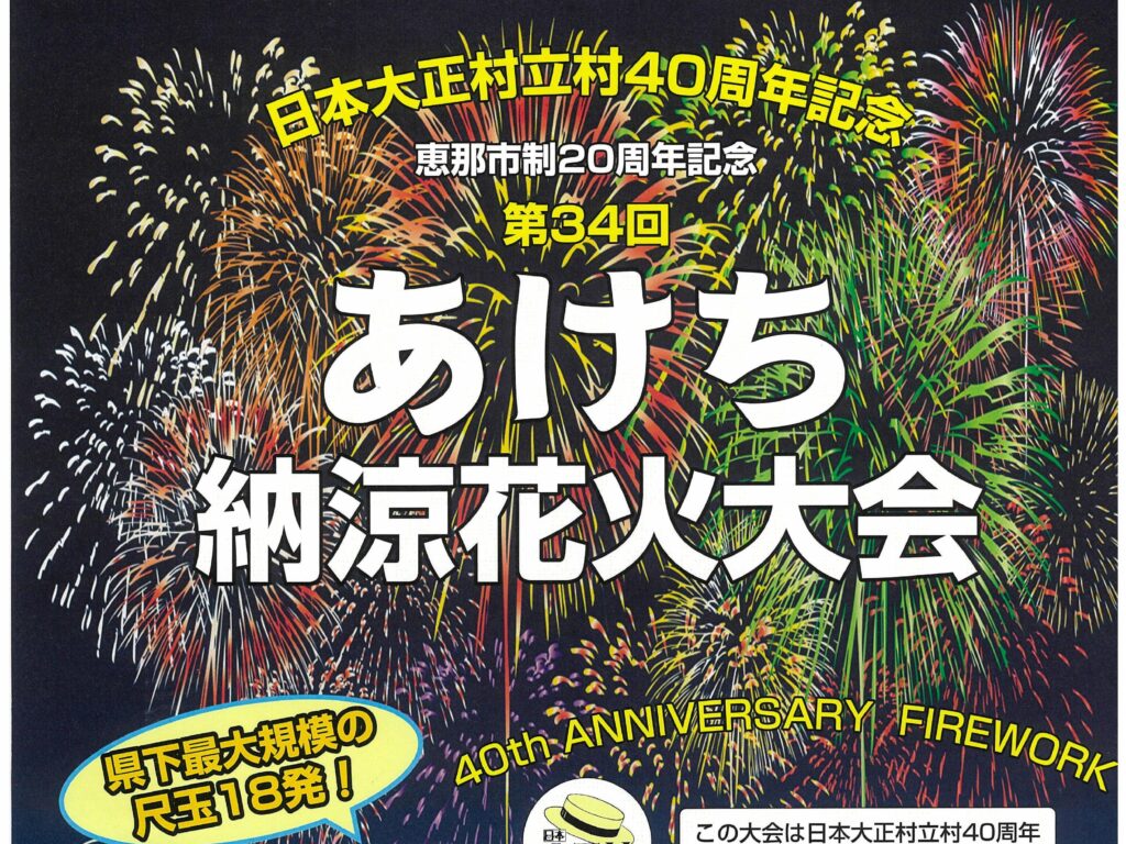 「日本大正村立村40周年記念・恵那市制20周年記念・第34回明智町納涼花火大会」開催のお知らせあけちだより8月号8月9月の大正村情報「相続登記に関する勉強会」開催のお知らせ大正村花蓮園の蓮が咲きました「明智ぎおん祭」開催のお知らせ明智みらい会議の情報誌「紡ぐ」vol.11あけちだより7月号7月8月の明知鉄道情報「八王子神社茅の輪くぐり」のお知らせ「第3回ホタル観賞会in下が淵」開催のお知らせあけちだより6月号 1234567