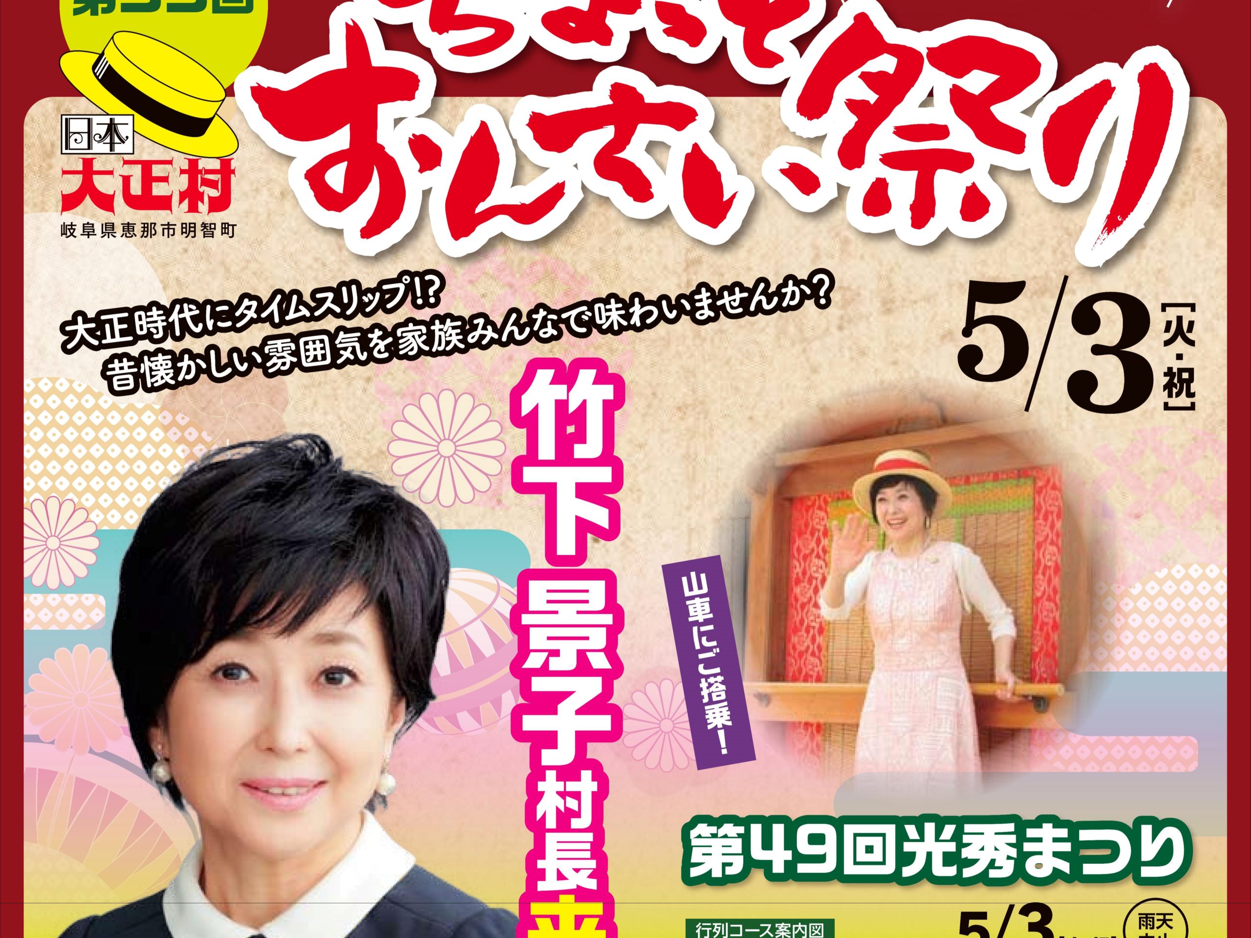 日本大正村「バラ園開園セレモニー」開催のお知らせ「第33回ちょっとおんさい祭り・第49回光秀まつり」開催のお知らせ「クラシックカーフェスティバル2022」開催のお知らせ「え~な!!日本大正村・恵那峡リモート・チャレンジラン2022」参加者募集のお知らせ「第31回明智町花火大会~明智光秀からの贈り物~」開催のお知らせ「ウィンターイルミネーション2021」点灯のお知らせ「大正村かえでまつり」開催のお知らせ「第48回光秀まつり」開催のお知らせ「下が淵紅葉ライトアップ」開催のお知らせ 12345678